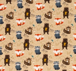 Teplákovina potlač lesné zvieratká na béžovej, ľahko počesaná
