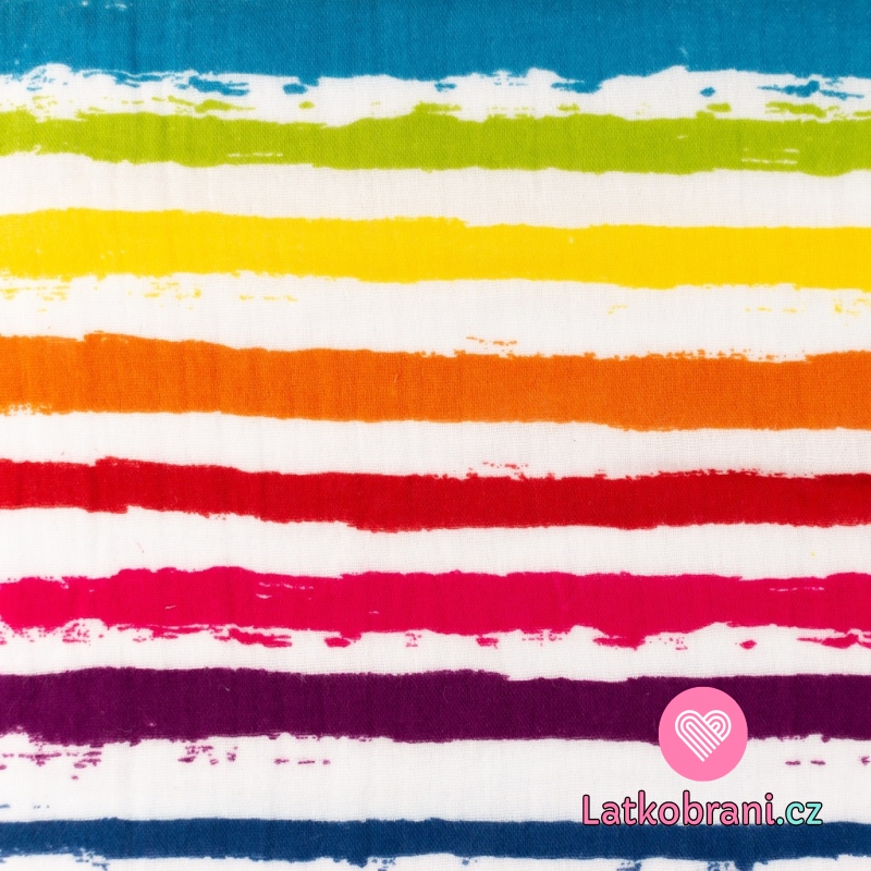 Dvojitá gázovina / mušelín maľované farebné prúžky na biele