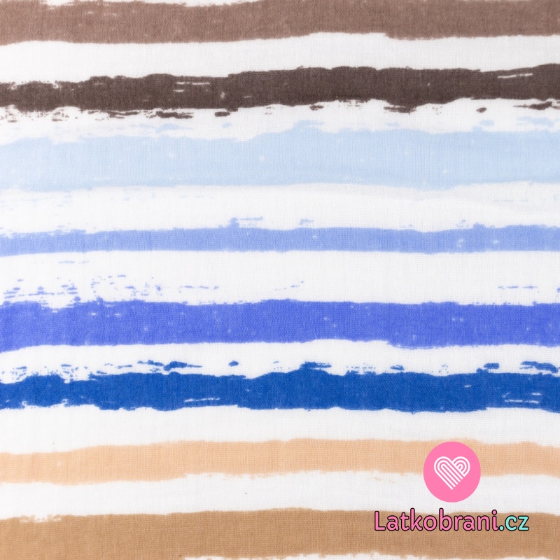 Dvojitá gázovina / mušelín maľované prúžky do modra na bielej
