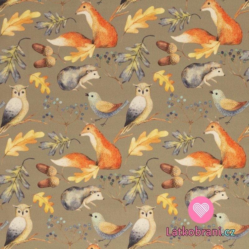 Bavlnené plátno potlač zvieratká na jeseň na kapučínové