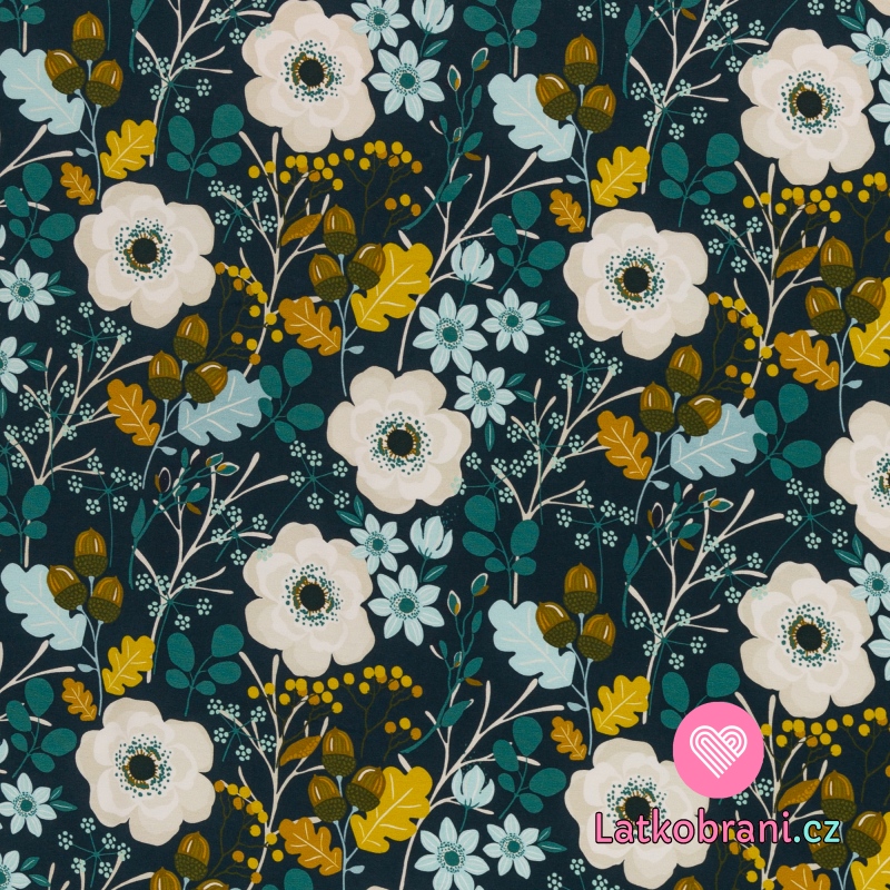 Teplákovina potlač jesenné kvítí na petrolejovej, ľahko počesaná