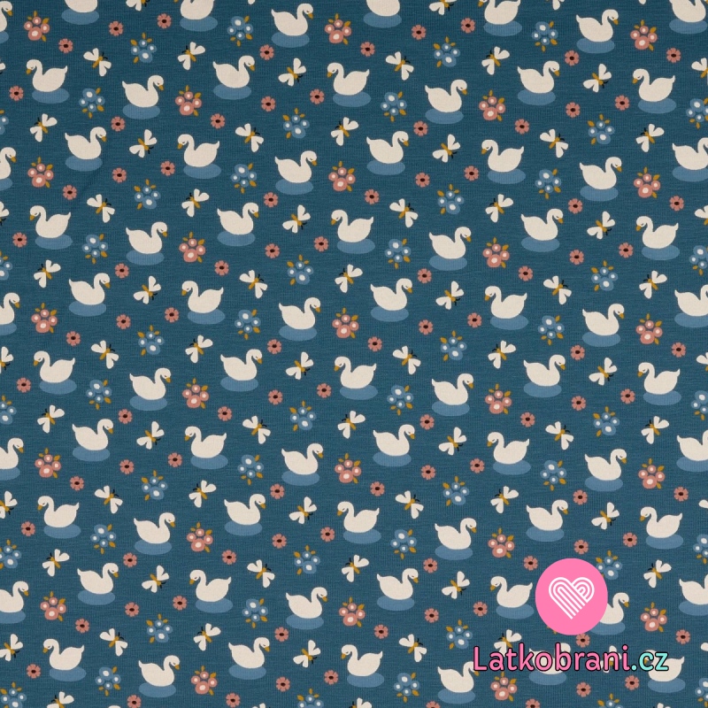 Úplet z organickej bavlny potlač labute medzi kvietkami na jeansový modrej
