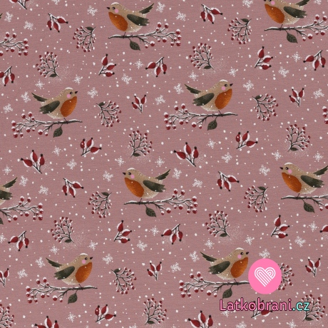 Úplet potlač vtáčik na zamrznutom šípkovom kríku na staroružovej