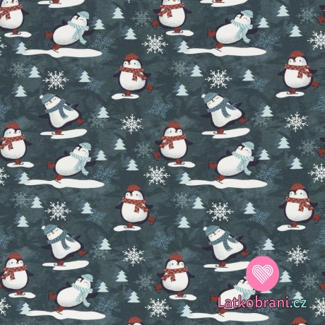 Teplákovina počesaná potlač tučniaky na korčuliach na šedo-modré
