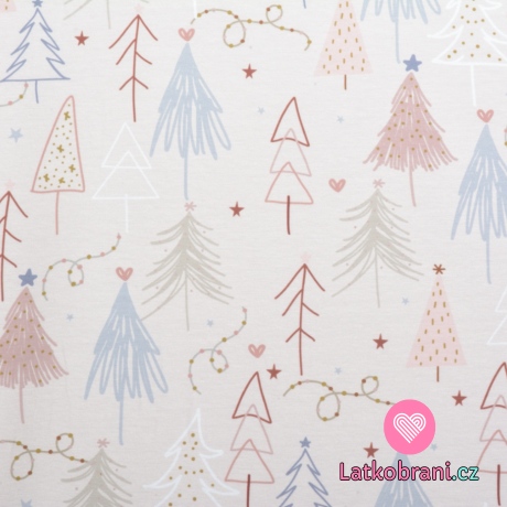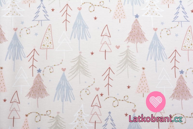 Úplet potlač kreslené vianočné stromčeky na béžovej