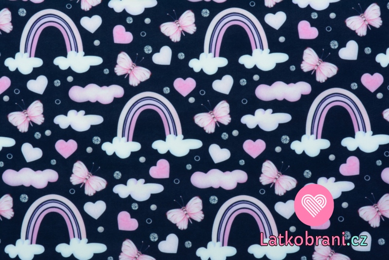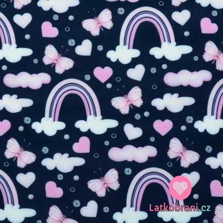 Pružný softshell motýlikovia medzi dúhami na tmavo modrej, s fleecom