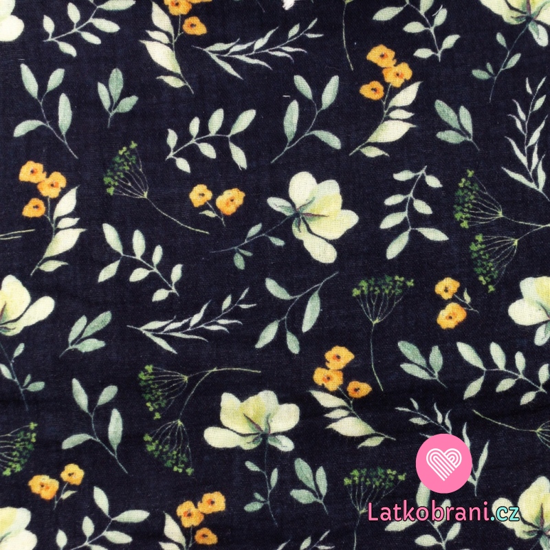 Dvojitá gázovina / mušelín kvety a listy na tmavo modrej