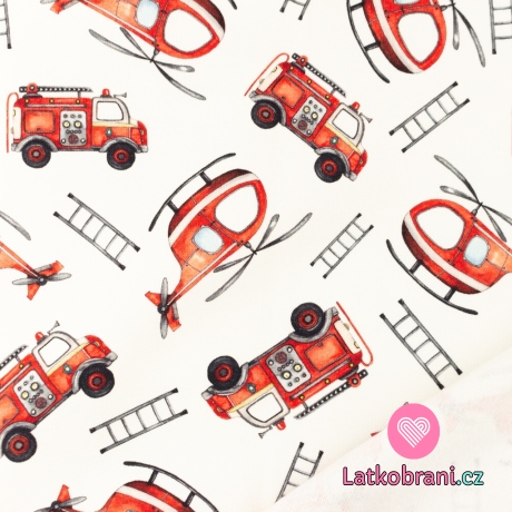 Teplákovina počesaná potlač hasičský automobil a vrtuľník na biele