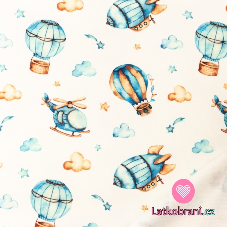 Teplákovina česaná potlač lietajúci balón, vzducholoď a vrtuľník na bielej