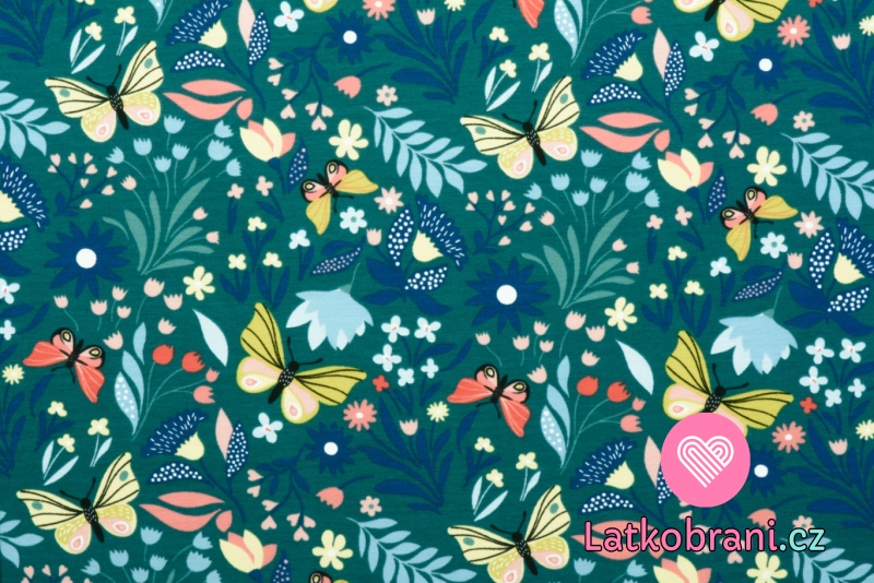 Teplákovina potlač motýliky a kvety na petrolejovo modrej