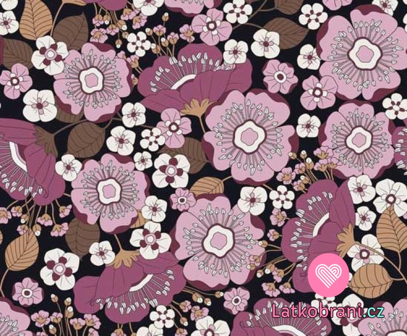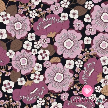 Úplet potlač ružové kvety na čiernom podklade