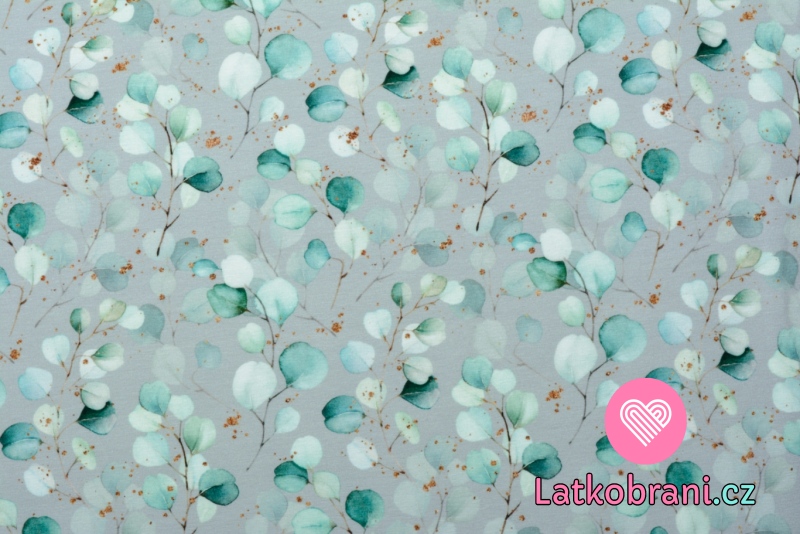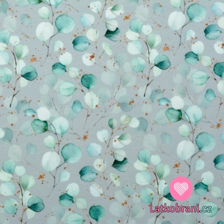 Úplet potlač lístky eukalyptu na šedej, BIO