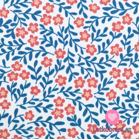 Bavlnené plátno ružovo - červené kvety s modrými listami na biele
