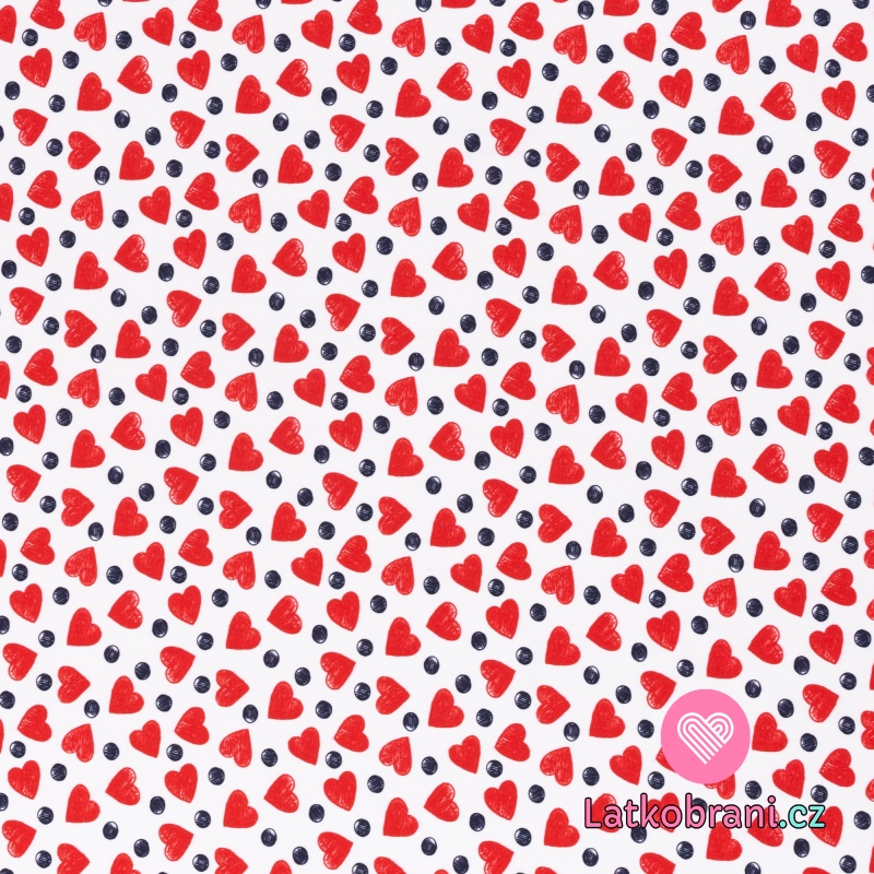 Úplet potlač červená srdiečka medzi bodkami na biele