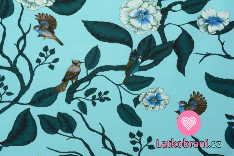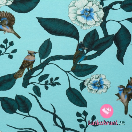 Úplet potlač kvety a vtáčiky na modrom podklade