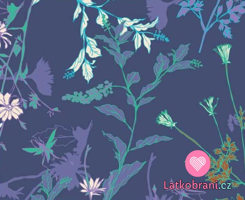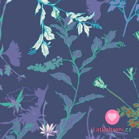 Viskózový úplet kvietky s lístočkami na modrej