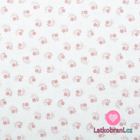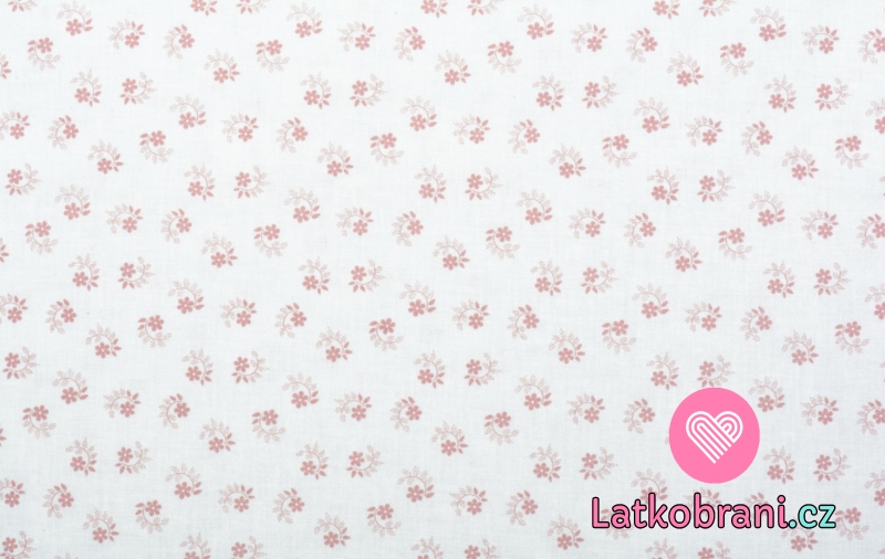 Bavlnené plátno staroružovej kvietky s lístočkami z bodiek na biele
