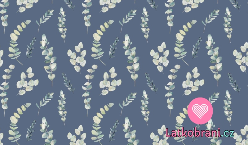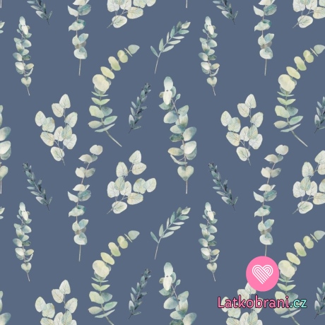 Viskózový úplet vetvičky eukalyptu na tmavo modrej jeans