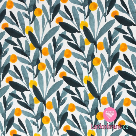 Úplet potlač lístočky so žltými bobuľkami na prírodné biele