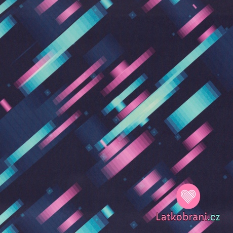 Pružný softshell jarná/letná potlač abstraktné čiarky ružovej a modrej na tmavo modrej, obojstranný