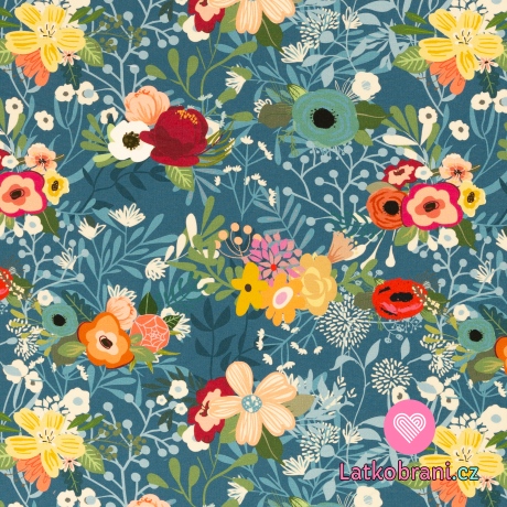Teplákovina s prímesou modalu potlač farebné kvety na modrej