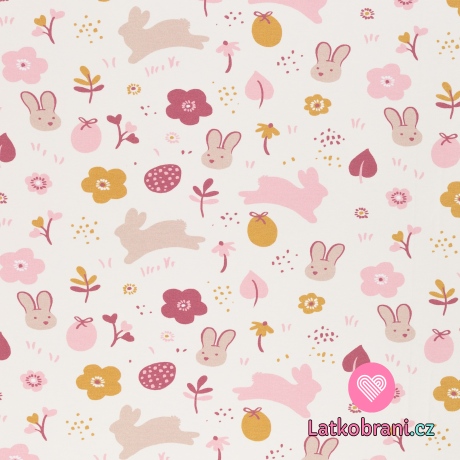 Úplet potlač veľkonočný zajačik a vajíčka medzi kvietkami na smotanovej