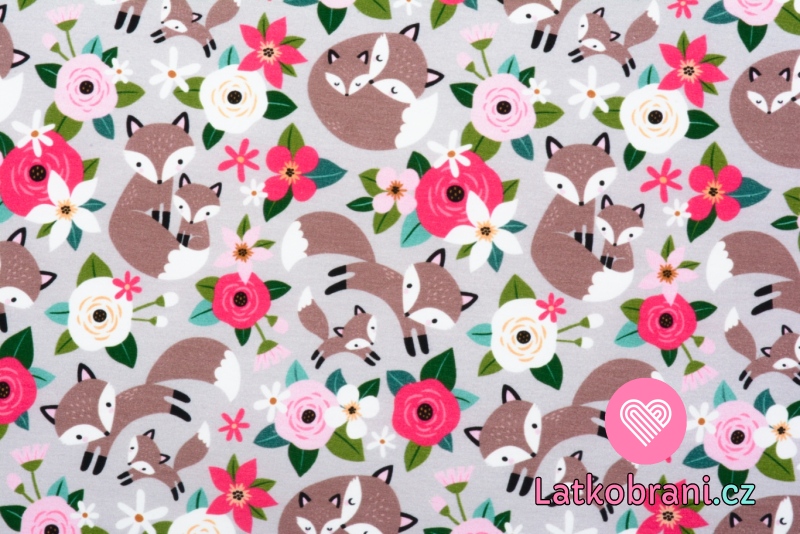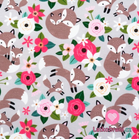 Teplákovina potlač lištičky medzi kvietkami na šedej