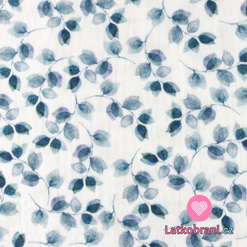 Dvojitá gázovina / mušelín vetvičky s modrými listami na biele