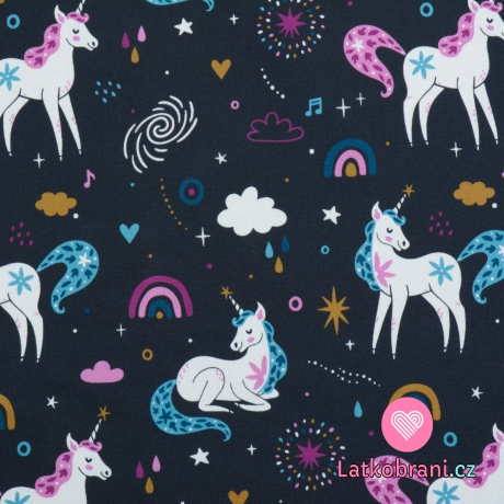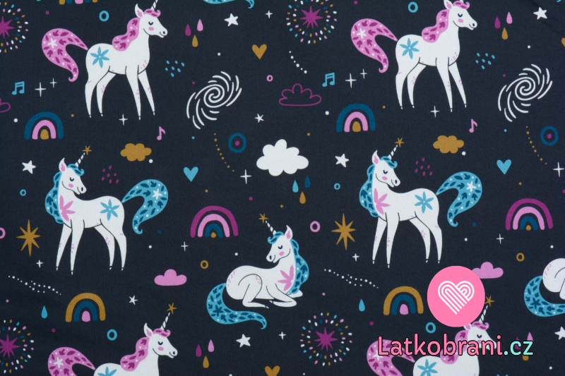 Softshellová potlač jednorožca na tmavomodrej nočnej oblohe s fleecom