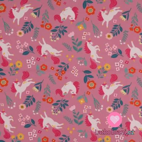 Softshellová potlač jednorožcov medzi kvetmi na ružovom pozadí
