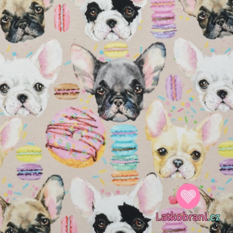 Teplákovina buldočky s makrónky na béžovo šedej