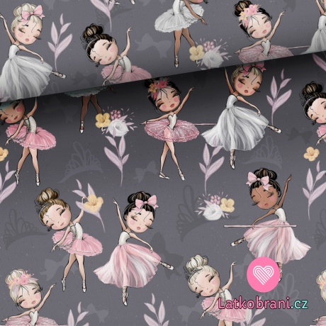 Teplákovina potlač tancujúce baletky na šedej
