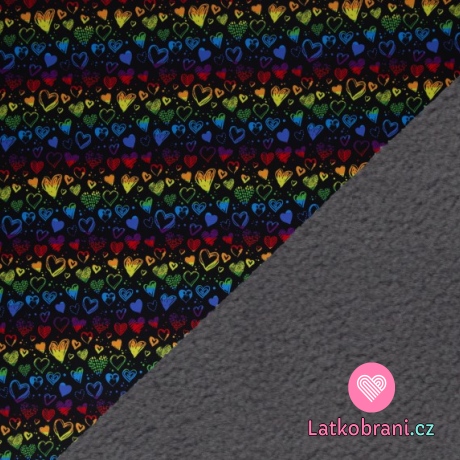 Softshell s fleecovou potlačou farebne maľované srdiečka na čiernej farbe