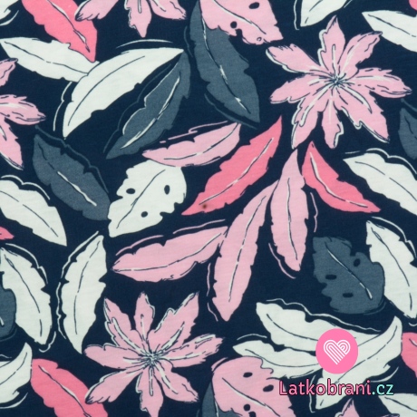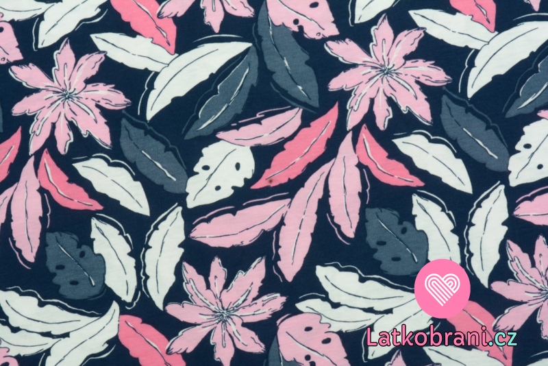 Bavlnený jednolícny úplet potlač banánové listy na modrej