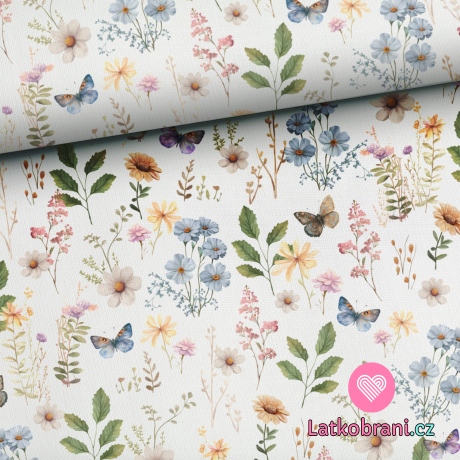 Teplákovina potlač motýliky medzi lúčnymi kvietkami na biele