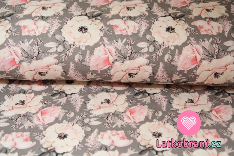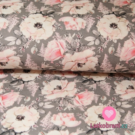 Teplákovina ružičky jemne ružové na šedej
