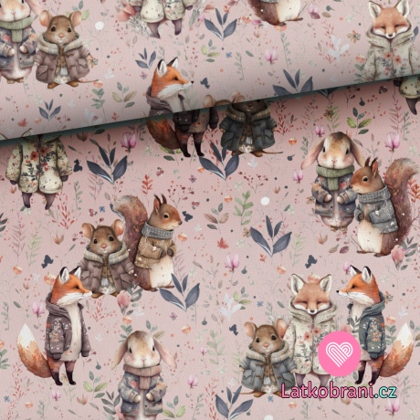 Teplákovina potlač lesné zvieratká v kabátiku na ružové