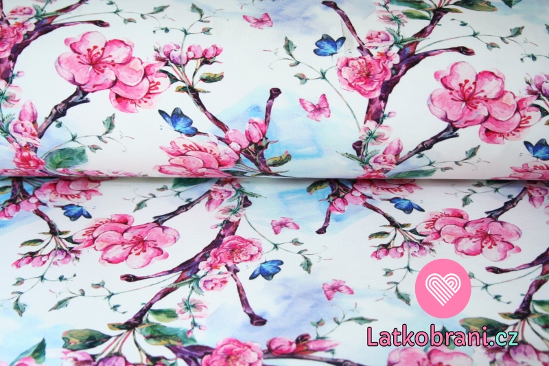 Teplákovina rozkvitnutá čerešňa s motýliky na smotanové