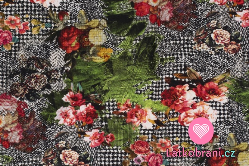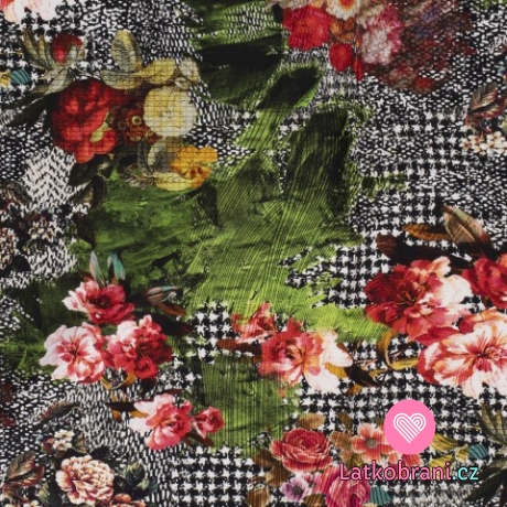 Úplet potlač pestré kvety a lupene na čiernobielom Pepita