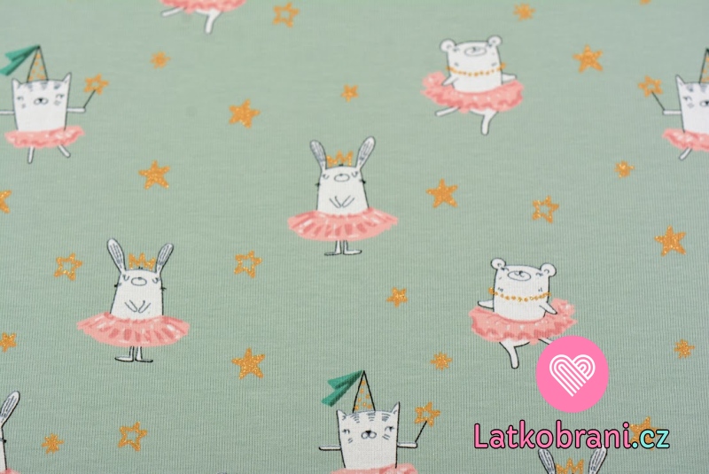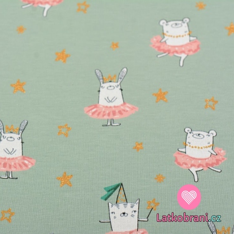 Úplet potlač tancujúce zvieratká v sukienke medzi trblietavými hviezdičkami na starozelené