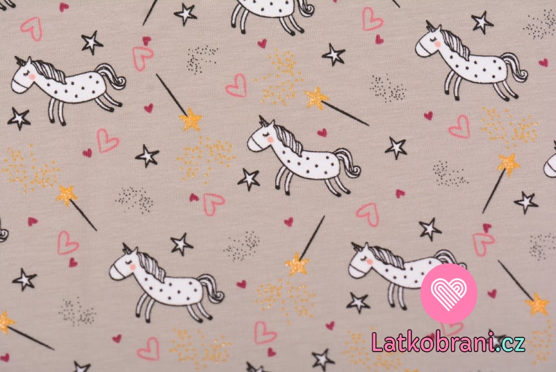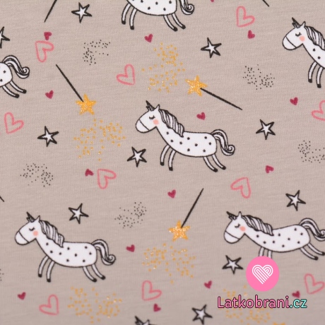 Úplet potlač magičtí jednorožcovi medzi trblietavými kúzelnými paličkami na šedo-béžovej