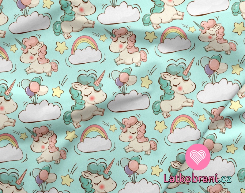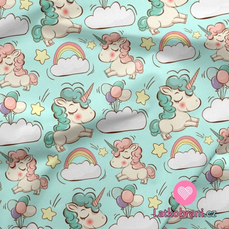 Teplákovina potlač malí jednorožce v obláčikoch medzi mráčky a dúhou na zelenkavá-modré