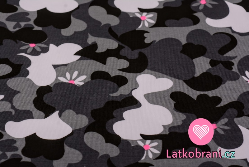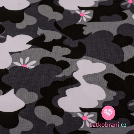 Teplákovina potlač srdiečka a neonková kvietky na maskáč šedo - čiernom