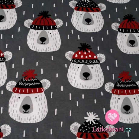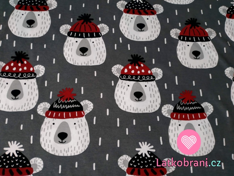 Bavlnený úplet medvedík s čiapkou na šedej