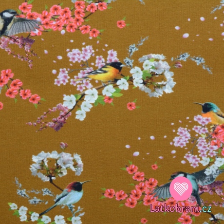 Teplákovina počesaná vtáčiky medzi farebnými kvetmi na tmavšie okrovej