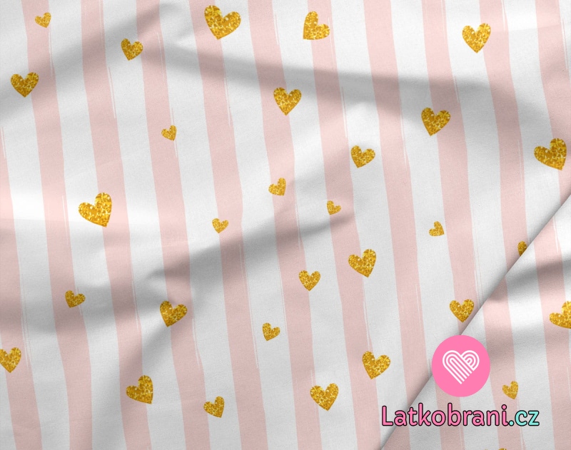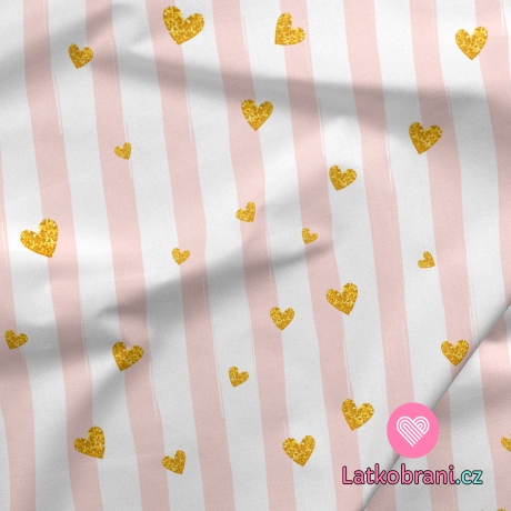 Teplákovina potlač zlatá srdiečka na ružovo-bielych prúžkoch