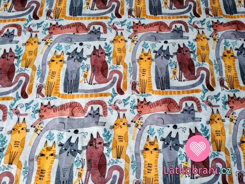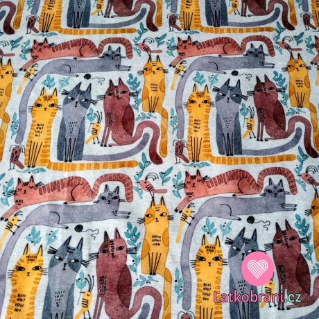 Teplákovina potlač partia farebných mačiek na šedom melé