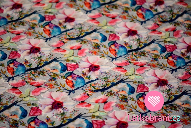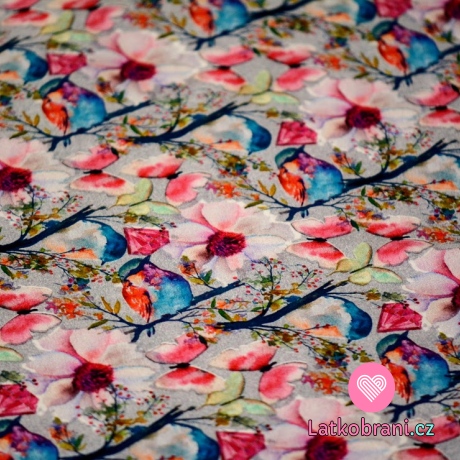 Teplákovina potlač pestré kvety, motýle a vtáčiky na šedej