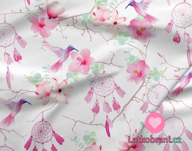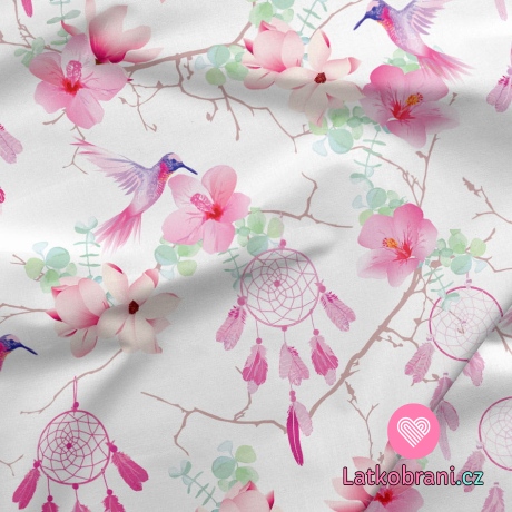 Teplákovina potlač ružové lapače snov s kvetmi a kolibríky