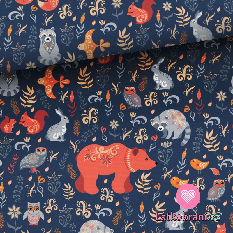Teplákovina potlač zdobená lesné zvieratká na tmavo modré
